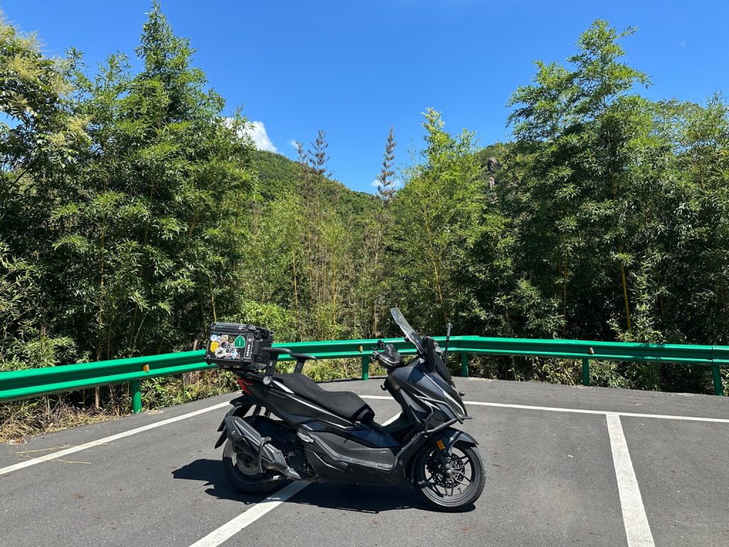 路的尽头是这个小小的停车湾。四周被竹林包围,风一吹,竹叶沙沙,像在欢迎远道而来的旅人。我把车停好,坐在护栏旁喝水,看着自己的摩托在阳光下闪着微微的光。黑色车身安静又沉稳,像是陪我走了很远的老朋友。